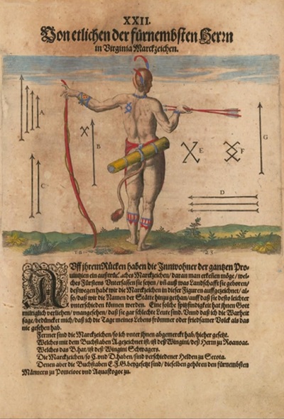 "The Princes of Virginia are attyred in suche manner as is expressed in this figure. They weare the haire of their heades long and bynde opp the ende of the same in a knot under their eares. Yet they cutt the topp of their heades from the forehead to the nape of the necke in manner of a cockscombe, strikinge a faier longe pecher of some berd att the Begininge of the creste uppun their foreheads, and another short one on bothe seides about their eares. They hange at their eares ether thicke pearles, or somewhat els, as the clawe of some great birde, as cometh in to their fansye. Moreover They ether pownes, or paynt their forehead, cheeks, chynne, bodye, armes, and leggs, yet in another sorte then the inhabitantz of Florida. They weare a chaine about their necks of pearles or beades of copper, wich they much esteeme, and ther of wear they also braselets ohn their armes. Under their brests about their bellyes appeir certayne spotts, whear they use to lett them selves bloode, when they are sicke. They hange before them the skinne of some beaste verye feinelye dresset in suche sorte, that the tayle hangeth down behynde. They carye a quiver made of small rushes holding their bowe readie bent in on hand, and an arrowe in the other, radie to defend themselves. In this manner they goe to warr, or tho their solemne feasts and banquetts."