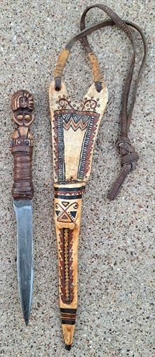 "By the eighteenth century, the Eastern Native Americans were increasingly using metal daggers as weapons of war. Prior to the arrival of the colonists, Indian blades were made largely of bone or rock, the latter 'pressure-flaked' with the edge of an antler to form a rudimentary but dangerous blade. Some copper blades were manufactured, but with the arrival of the settlers the Indians began to purchase far more durable iron blades. A particularly popular style of knife was the 'beaver tail' blade that, as its name suggests, had a broad double-edged blade tapering to an efficient point. The Indians developed gaudy sheaths to go with their blades, often encompassing hilt as well as blade, possibly suggesting that the knives were used more for utility and hunting than as a rapid-response weapon in combat. The Indians also made their own knives by sharpening up pieces of scrap metal and wrapping the 'tang' (handle) with strips of hide to form a basic hilt."