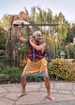 "[P]uede deducirse mucho de las posteriores fuentes moras, trabajos literarios y de la comparación con otros piratas de la esfera del sudeste de Asia. Un grabado de madera de 1848 musetra un barco prahu iranun montado con cañones y su tripulación vitiendo pantalones, blusas, chalecos, sarongs y turbantes -- mas o menos comparables a la vestimenta de otros marineros de la región. Se observan varias lanzas y al menos un alfanje (probablemente un kris, metido dentro de la cintura de un pirata). Un litografía de la misma fuente muestra a un 'jefe malayo' de Jolo ataviado de forma similar, con dos krisses mostrados claramente y metidos, nuevamente, en la cintura. Este pirata, a diferencia de los otros, no viste blusa y pantalones, sino que únicamente lleva una camisa sin mangas y un sarong con su turbante. El y varios de los piratas prahu, en contraste con la ilustración del jefe malayo, son mostrados con un trozo de paño anudado a modo de correa sobre el turbante; esto podría ser para asegurar un pequeño casco o gorra armada no visible claramente en el material gráfico." [references omitted]