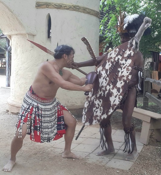 "There were two principal types of weaponry -- the short club and the long club or staff. The latter were made of wood and used with both hands. They included colorful taiaha, ornamented tewhatewha with an axe-like head, and plain but effective pouwhenua. There was also the hoeroa, made from elegantly curved whalebone. Measuring between 1.5 and 2.7 m long, depending on the height of the wielder, these long weapons thrust, parried and sliced, maintaining a defensive radius."