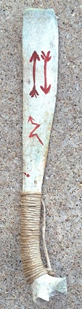 Ce fouet à cheval, à l'inscription <<King 1800>>, pourrait être l'artefact ethnographique le plus ancien des Plaines du Nord. En 1804, James King, un commerçant de fourrures, était assassiné en Saskatchewan. Sa femme, non identifiée, était Pied-Noir ou Sarci. C'est probablement ell qui a fabriqué le bracelet à piquants de porc-épic et King a sans doute gravé la poignée. Ce fouet illustre le mélange et l'interdépendance des cultures européennes et amérindiennes au début du commerce de fourrures chez les Indiens des Plaines. ..."