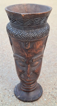 ".... For centuries among the Kuba, indications of personal status have been an important element in crafted objects. Even ordinary utilitarian items such as drinking cups for palm wine may indicate wealth and status through elegant carvings and decorations. Frequently cups intended for use by rulers are carved in the form of a human head with a distinctive hairstyle associated only with royalty. Far more rare are cups carved with full figures."