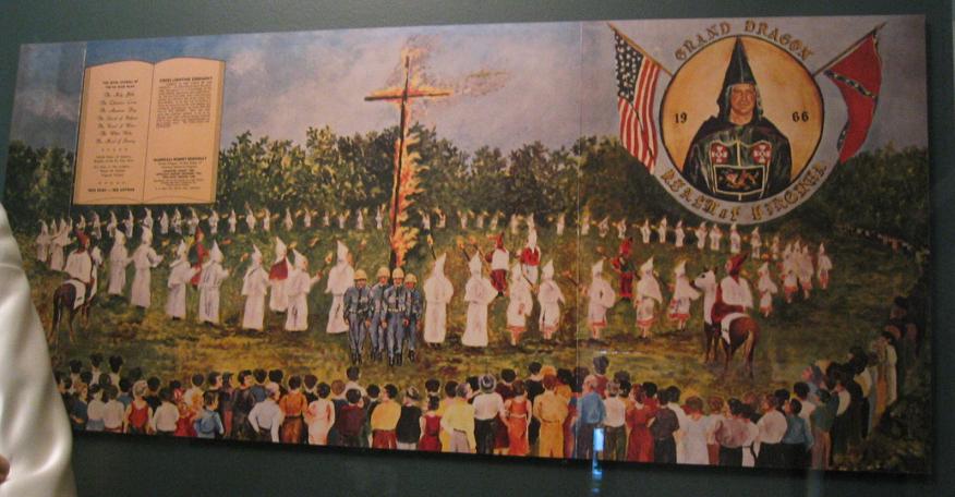 "The print behind this KKK robe is by Virginia Grand Dragon Marshall Kornegay and is dated 1966. Although the Klan was visible in Virginia, in opposition to civil rights for African Americans, the Virginia government was vigilant against the kind of Klan violence symbolized by the Klan night rider on horseback a [SIC] c. 1925 painting from Oyster, Northampton County, on the Eastern Shore.