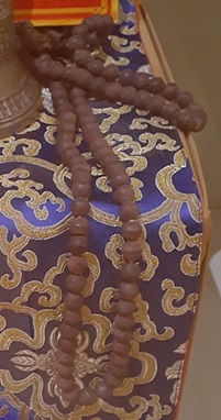 "Rosaries in fine materials -- turquoise, amber, and coral beads accented by gold and other precious gems -- may have been worn by monks or by the wealthy Buddhist laity of both sexes. Yuthok speaks of 'a fashion of wearing rosary beads wrapped around the arms at the wrist. One hundred eight beads, the number necessary for a rosary, were made from coral and turquoise. Sometimes some smaller beads made out of coral or even glass or plastic would be added to the one hundred and eight beads just for decoration.' In an iconic photograph taken in Darjeeling, India, around 1910-12, the Thirteenth Dalai Lama is holding a rosary."